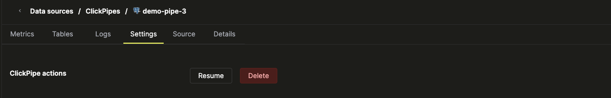 - На вкладке Data Sources нажмите на MySQL ClickPipe, который вы хотите возобновить. Статус конвейера изначально должен быть Paused.